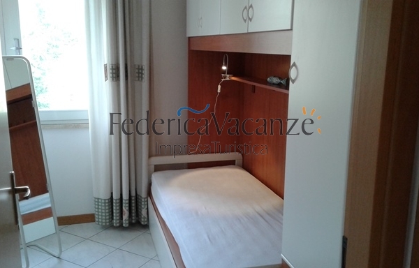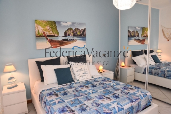 Dispone di soggiorno-pranzo con divano letto matrimoniale, angolo cottura a vista, una camera matrimoniale, una cameretta con due letti singoli e armadio a ponte, bagno con cabina-doccia, due balconi con tavolo e sedie da esterno.